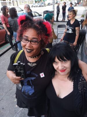 A fully grown Sumiko Saulson with Lydia Lunch—their favorite poet during high school—and a signed whisky flask outside the Ivy Room in Albany, California (near Berkeley).