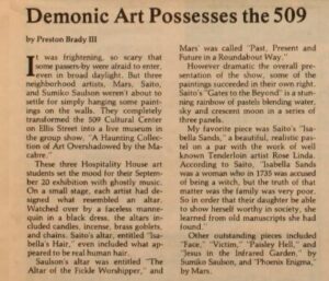 “It was frightening, so scary that some passers-by were afraid to enter, even in broad daylight. But three neighborhood artists, Mars, Saito, and Sumiko Saulson weren’t about to settle for simply hanging some paintings on the walls. They completely transformed the 509 Cultural Center on Ellis Street into a live museum in the group show, “A Haunting Collection of Art Overshadowed by the Macabre.” – Preston Brady III, “Demonic Art Possesses the 509” October 1987, The Tenderloin Times