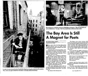 20-year-old Sumiko Saulson sits on the fire escape of their apartment in a photo for an article entitled “The Bay Area Is Still A Magnet for Poets” by Carlos Vidal Greth, in the May 16, 1988 issue of the San Francisco Chronicle